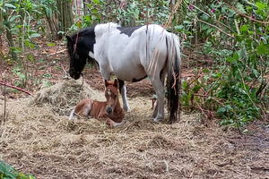 *Lily - 4 yrs. Black Pinto - 31.5 inches. Her current Chestnut colt, by Ringo, is for sale at $1,500 and will be weaned in early January.. Lily has received a deposit and will be picked up in January.